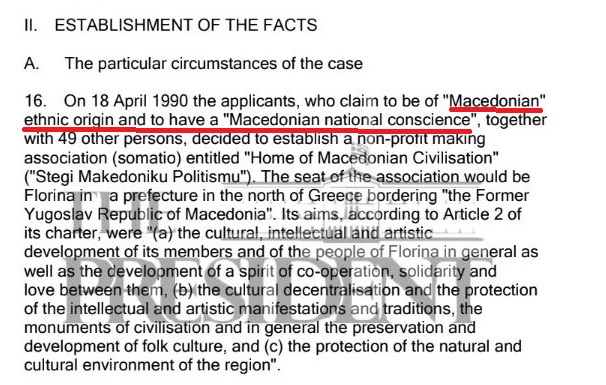 Τα πρόσωπα που προσφεύγουν κατά της Ελλάδας, ισχυρίζονται ευθέως ότι είναι «Μακεδόνες» και ότι χαρακτηρίζονται από «Μακεδονική εθνική συνείδηση»!