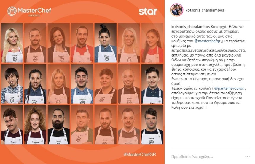 Ο Χαράλαμπος Κοτσώνης ήταν ένας από τους τελευταίους παίκτες που αποχώρησαν από το MasterChef, την περασμένη Τρίτη, πριν την Άλκηστη.