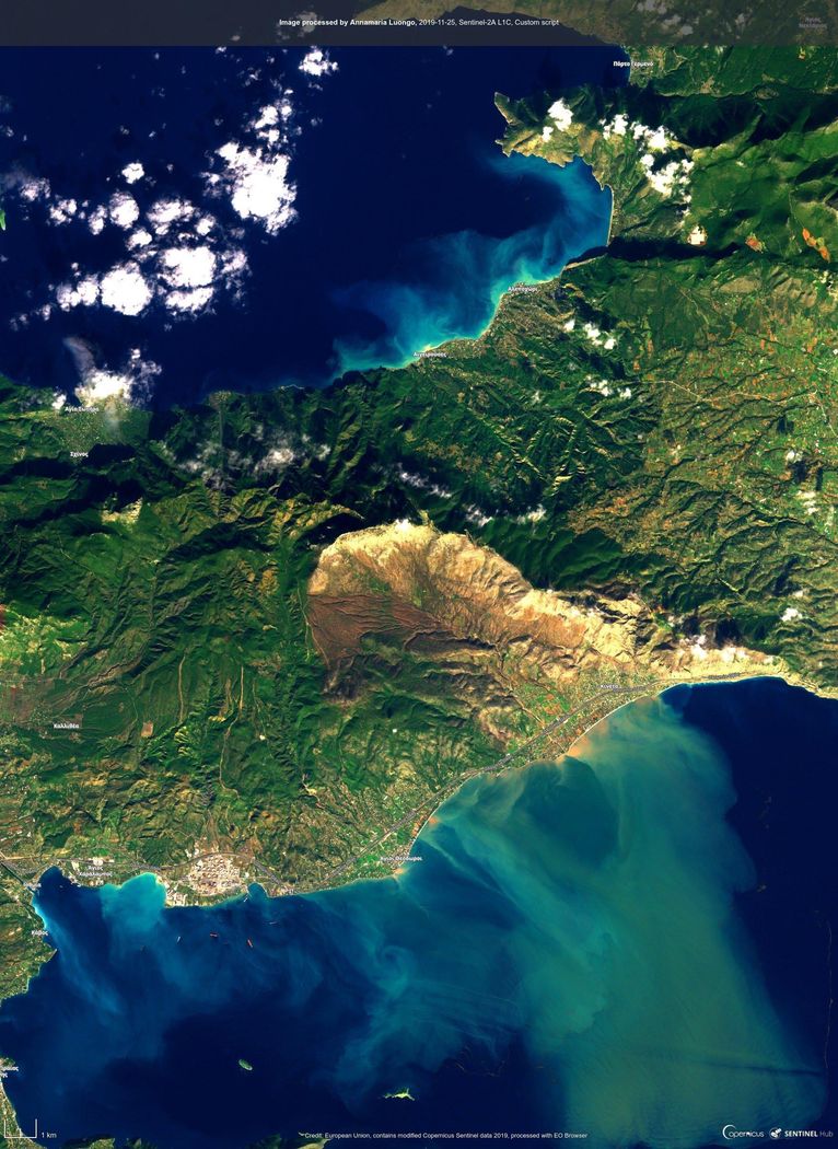 Ο ευρωπαϊκός δορυφόρος Sentinel-2 πέρασε πάνω από τη χώρα μας τη Δευτέρα 25 Νοεμβρίου κατά τη διάρκεια της κακοκαιρίας "Γηρυόνης", μετά το πέρασμα του μετώπου που προκάλεσε πλημμύρες στη Δυτική Αττική και την Ανατολική Κορινθία.