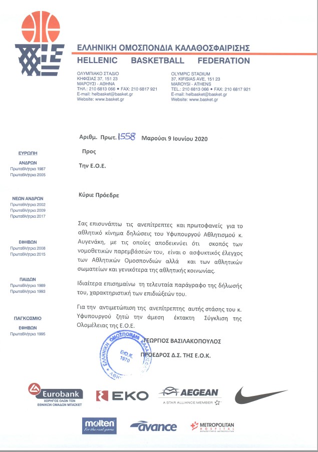 Η ΕΟΚ ζήτησε σύγκλιση της Ελληνικής Ολυμπιακής Επιτροπής μετά τις δηλώσεις που έκανε ο Λευτέρης Αυγενάκης, τον οποίο κατηγορεί για ανεπίτρεπτη στάση.