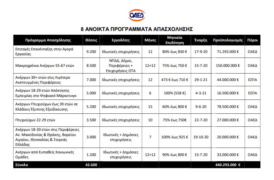 Στο πλαίσιο των νέων και βελτιωμένων ενεργητικών απασχόλησης του Υπουργείου Εργασίας και Κοινωνικών Υποθέσεων, ο ΟΑΕΔ υλοποιεί τα παρακάτω 8 ανοικτά προγράμματα, συνολικού προϋπολογισμού 440 εκατ. ευρώ με 42.600 επιδοτούμενες νέες θέσεις εργασίας και επιχορήγηση του μισθού και των ασφαλιστικών εισφορών σε ποσοστό έως και 100%.