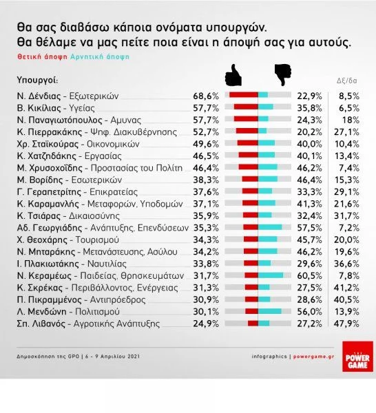 Αναφορικά με την αξιολόγηση των υπουργών, δημοφιλέστερος αναδεικνύεται ο υπουργός Εξωτερικών, Νίκος Δένδιας, με τον υπουργό Υγείας, Βασίλη Κικίλια να είναι δεύτερος και τον υπουργό Αμυνας, Νίκο Παναγιωτόπουλο να βρίσκεται στην τρίτη θέση. Την πρώτη τετράδα συμπληρώνει ο υπουργός Ψηφιακής Διακυβέρνησης Κυρ. Πιερρακάκης.
