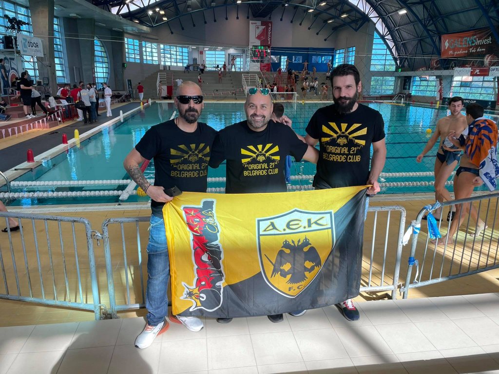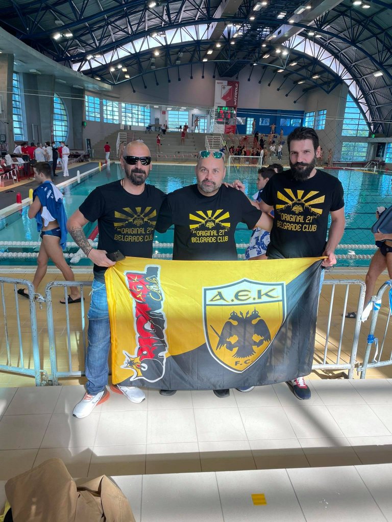 Πουθενά μόνη της! Φίλοι της ΑΕΚ από την Αθήνα και τις γειτονικές χώρες βρέθηκαν στο πλευρό της ανδρικής ομάδας πόλο που αγωνίστηκε στο Nόβι Σαντ. Οι Χρήστος, Παναγιώτης, Ορφέας και Άρης βρέθηκαν στο γήπεδο και παρακολούθησαν την αναμέτρηση με την Σανταμπέλ στηρίζοντας την ομάδα πόλο στις πρώτες ιστορικές ευρωπαϊκές συμμετοχές της.