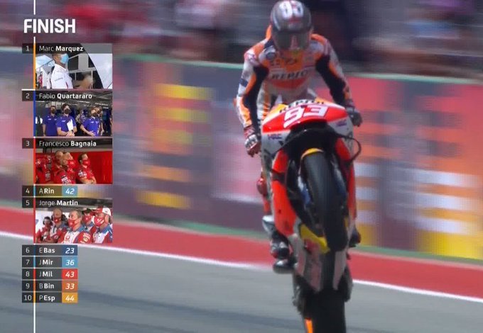 Ο Μαρκ Μάρκεθ ήταν άπιαστος στο Όστιν και με κυριαρχικό τρόπο πήρε τη νίκη στο GP ΗΠΑ, που είναι η δεύτερη για τον ίδιο και για τη Repsol Honda φέτος. Ο Φάμπιο Κουαρταραό της Yamaha πήρε τη 2η θέση και έκανε ένα αποφασιστικό βήμα για την κατάκτηση του φετινού πρωταθλήματος. Ενώ, στην 3η θέση τερμάτισε ο Πέκο Μπανάια με την εργοστασιακή Ducati, που κέρδισε πολλές θέσεις στο δεύτερο μισό του αγώνα.