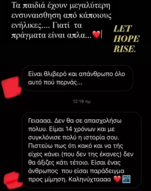 Την περασμένη Κυριακή ωστόσο δέχθηκε ένα μήνυμα που την άγγιξε λίγο περισσότερο. «Είμαι 14 χρονών και με συγκλόνισε πολύ η ιστορία σου. Πιστεύω πως ό,τι κακό και να της είχες κάνει (που δεν της έκανες) δεν θα άξιζες κάτι τέτοιο. Είσαι ένας άνθρωπος που είσαι παράδειγμα προς μίμηση. Καληνύχτα», έγραψε το μήνυμα που ανάρτησε στο Instagram.