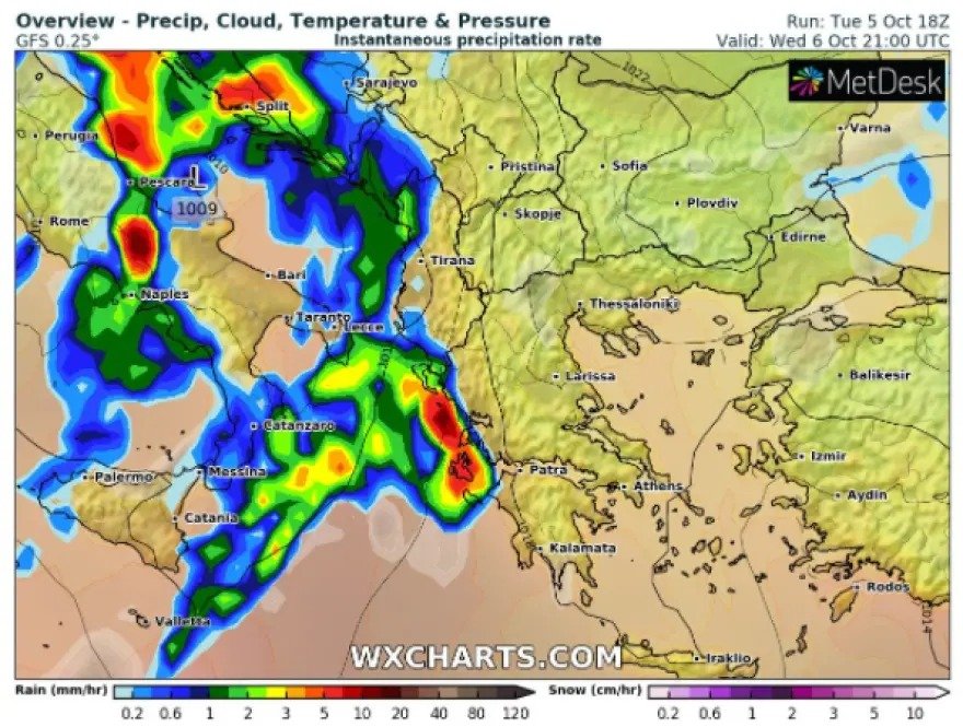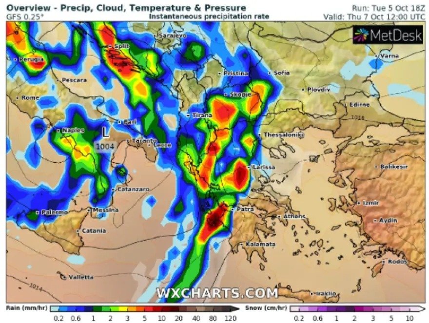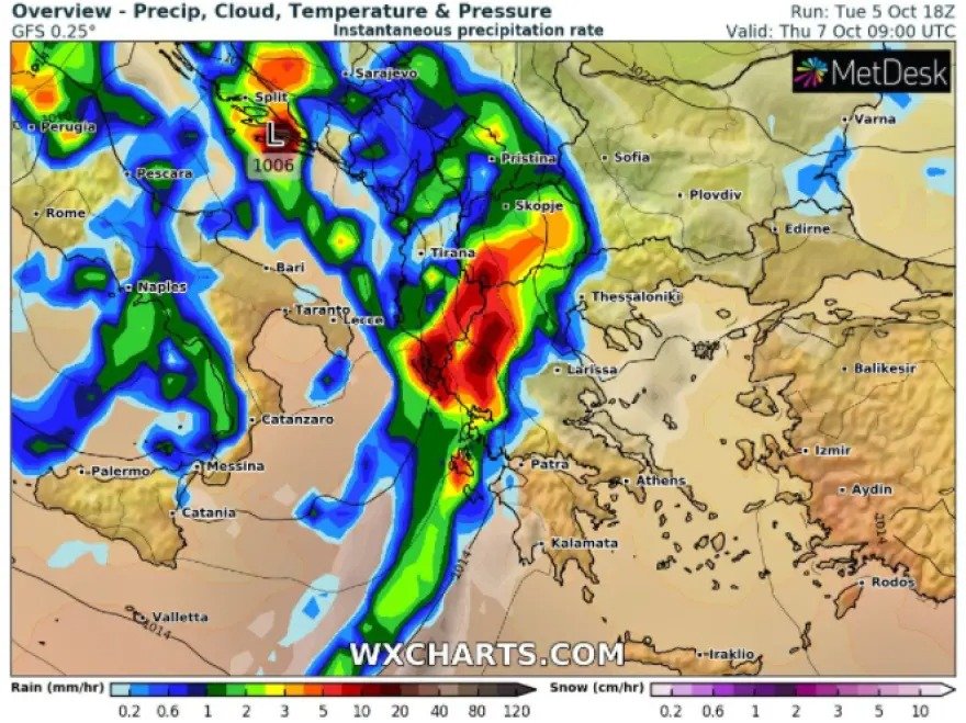 Στον προγνωστικό χάρτη που ακολουθεί παρουσιάζονται τα εκτιμώμενα αθροιστικά ύψη υετού (βροχές/ καταιγίδες) έως τις βραδινές ώρες της Παρασκευής 8 Οκτωβρίου.