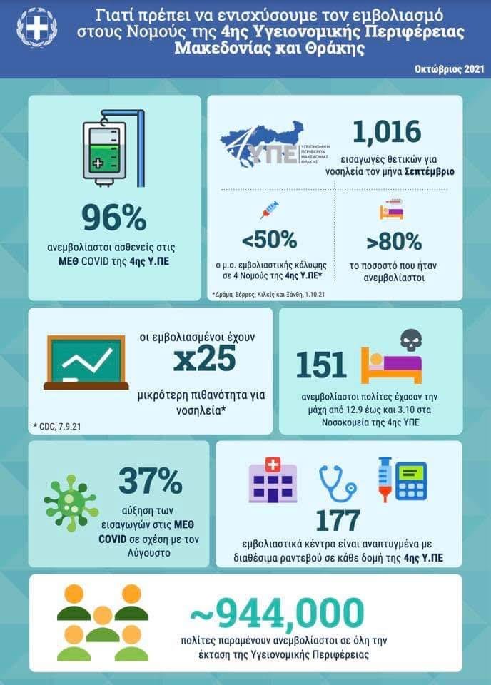 Ενδεικτικά, τον Σεπτέμβριο εισήχθησαν στα νοσοκομεία της 4ης ΥΠΕ 1.016 ασθενείς, οι οποίοι σε ποσοστό 80% ήταν ανεμβολίαστοι, ενώ το διάστημα 12 Σεπτεμβρίου με 3 Οκτωβρίου 151 ανεμβολίαστοι πολίτες που νοσηλεύονταν έχασαν τη ζωή τους εξαιτίας του κοροναϊού.