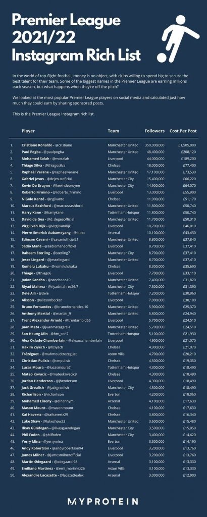 Η έρευνα του MyProtein αποτυπώνει τα ποσά που εισπράττουν οι ποδοσφαιριστές της Premier League, για μια ανάρτηση στο Instagram.