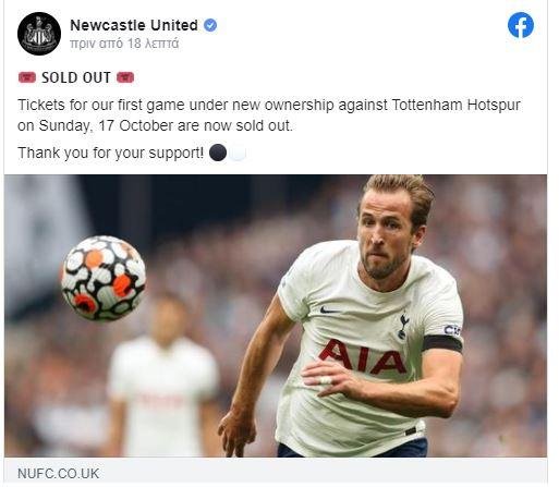 Η αλλαγή ιδιοκτησιακού καθεστώτος στην Νιούκαστλ είχε σαν συνέπεια να υπάρξει sold out, για το προσεχές εντός έδρας ματς με αντίπαλο την Τότεναμ το οποίο αποτελεί το πρώτο ματς της νέας εποχής.