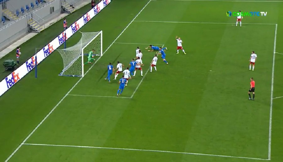 Tεράστια ευκαιρία για την Εθνική μας να κάνει το 0-1 αφού ο πορτιέρο της Γεωργίας έχασε την ισορροπία του και μάλλον η μπάλα πέρασε την γραμμή