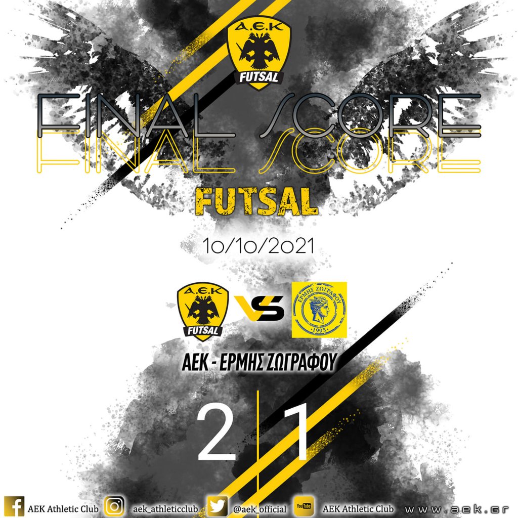 Η ομάδα ποδοσφαίρου σάλας της ΑΕΚ συνέχισε ιδανικά την πορεία της στο Πρωτάθλημα. Η Ένωση πήρε το ντέρμπι απέναντι στον Ερμή Ζωγράφου, τον οποίο νίκησε με 2-1, στο πλαίσιο της 3ης αγωνιστικής της Futsal Super League, σε ένα παιχνίδι που πραγματοποιήθηκε στο κλειστό του Καματερού.