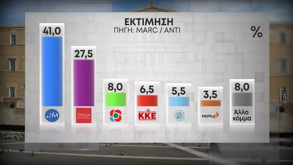 Παράλληλα, καταλληλότερος πρωθυπουργός παραμένει ο Κυριάκος Μητσοτάκης, ενώ στην εκτίμηση ψήφου η ΝΔ λαμβάνει 41% έναντι 25,5% του ΣΥΡΙΖΑ. Ακολουθούν το ΚΙΝΑΛ με 8%, το ΚΚΕ με 6,5%, η Ελ. Λύση 5,5%, το ΜέΡΑ25 με 3,5%. Αλλο κόμμα επιλέγει το 8%.