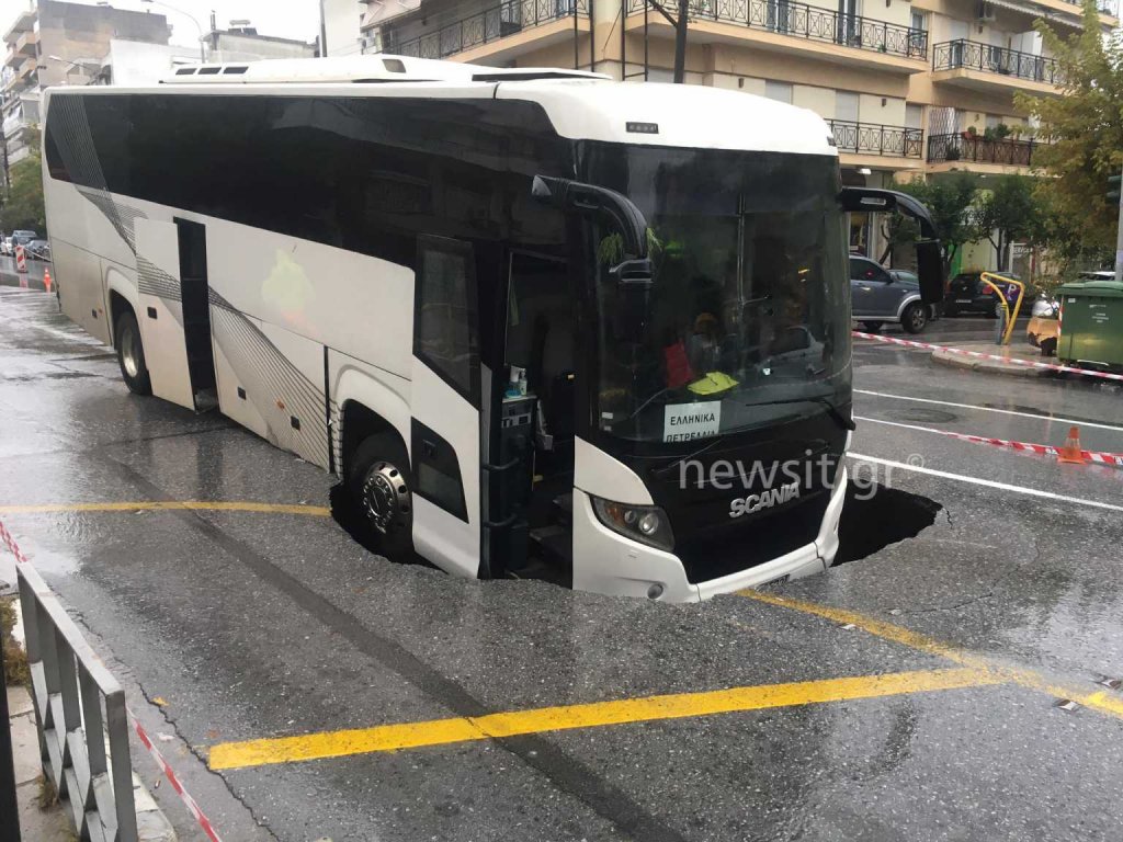 Το λεωφορείο -που χρησιμοποιείται από την «Ελληνικά Πετρέλαια» για τη μεταφορά εργαζομένων είχε σταματήσει επί της Εθνικής Αντιστάσεως προκειμένου να επιβιβαστούν εργαζόμενοι, όταν… άνοιξε ο δρόμος και «κατάπιε» το μπροστινό μέρος.