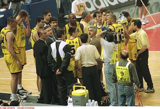 *Στη βασική φωτό, ο Κώστας Καπούρος, πρώτος από δεξιά, σε τάιμ άουτ του ημιτελικού της ενιαίας Ευρωλίγκας του 1998, ΑΕΚ-Μπενετόν.