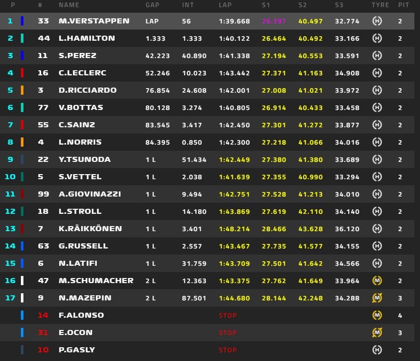 Η στρατηγική των δύο ομάδων που οπροηγούνταν έπαιξε σημαντικό ρόλο και οι τελευταίοι γύροι ήταν συγκλονιστικοί. Ο Χάμιλτον βρισκόταν σε απόσταση αναπνοής από τον Φερστάπεν και πίεζε για να προσπεράσει. Τελικά όμω ςο οδηγός της RedBullείδε πρώτος την καρό σημαία και έδειξε και πάλι ότι είναι ικανός φέτος να κατακτήσει το πρωτάθλημα.