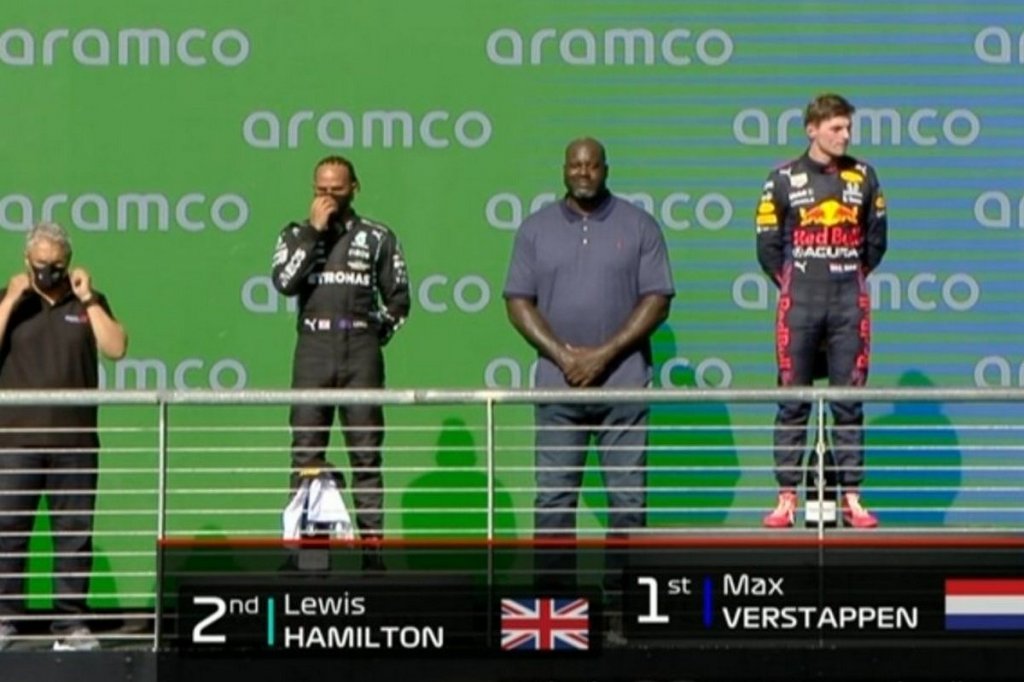 Μόνο που δεν τον ενημέρωσε κανείς πως έπρεπε να αποχωρήσει, με αποτέλεσμα ο Σακίλ να μείνει ανάμεσα στον Φερστάπεν και τον Χάμιλτον και να παρακολουθεί ακίνητος την διαδικασία!