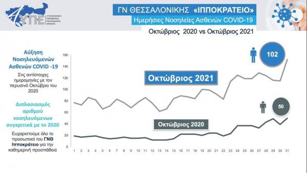 Σύμφωνα με αυτήν, το μήνα Οκτώβριο οι ημερήσιες νοσηλείες σε απλές κλίνες covid -19 διπλασιάστηκαν στο Ιπποκράτειο σε σχέση με τον Οκτώβριο του 2020.