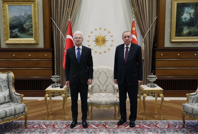 Οι φωτογραφίες, που δημοσιοποιήθηκαν στον επίσημο λογαριασμό του Τούρκου προέδρου, δείχνουν τον Ερντογάν να δέχεται την επιστολή διαπίστευσης του Λιθουανού πρέσβη και να φωτογραφίζεται μαζί του.