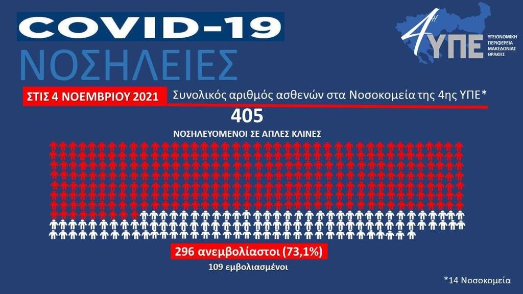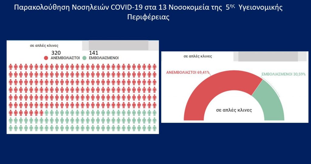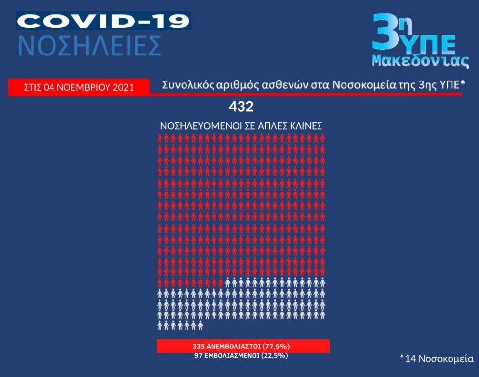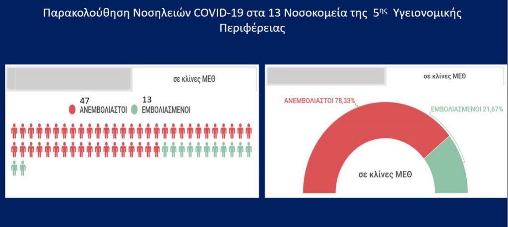 Όπως ανέφερε, κατά τη σημερινή ενημέρωση για την πανδημία, η αναπληρώτρια υπουργός Υγείας, Μίνα Γκάγκα, σε ΜΕΘ της 3ης ΥΠΕ νοσηλεύονται 92 ασθενείς, το 93% εκ των οποίων ανεμβολίαστοι, ενώ σε θαλάμους με υψηλή ροή οξυγόνου νοσηλεύονται 30 ασθενείς -στην πλειοψηφία τους ανεμβολίαστοι- και σε κοινούς θαλάμους 432 ασθενείς, το 77% των οποίων ανεμβολίαστοι. Αντίστοιχα, στην 4η ΥΠΕ, νοσηλεύονται σε ΜΕΘ 67 ασθενείς (το 91% ανεμβολίαστοι) και σε κοινούς θαλάμους 405 (το 73% ανεμβολίαστοι). Τέλος, στην 5η ΥΠΕ, το 69% των ασθενών σε κοινούς θαλάμους είναι ανεμβολίαστοι.