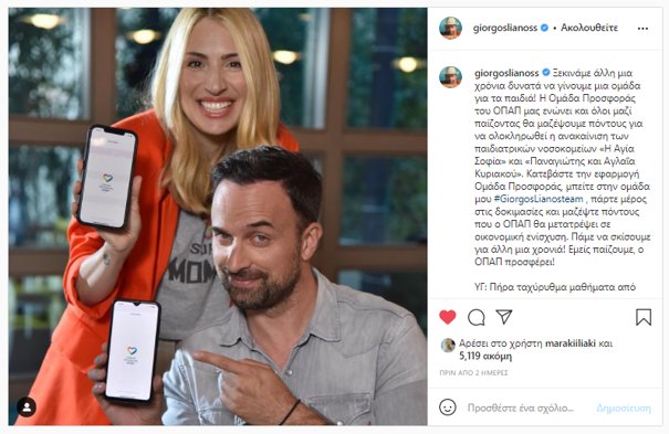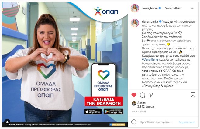 Η Έλενα Παπαρίζου, ο Χρήστος Μάστορας, η Δανάη Μπάρκα, ο Γρηγόρης Αρναούτογλου, ο Γιώργος Λιανός, η Μαρία Ηλιάκη και πολλοί ακόμη διάσημοι μπήκαν στην «Ομάδα Προσφοράς ΟΠΑΠ» και μας καλούν να τους ακολουθήσουμε, ώστε όλοι μαζί να δώσουμε δύναμη στο έργο ανακαίνισης των παιδιατρικών νοσοκομείων «Η Αγία Σοφία» και «Παναγιώτης και Αγλαΐα Κυριακού». Πρόκειται για ένα σημαντικό έργο που υλοποιεί ο ΟΠΑΠ, στο οποίο όλοι μπορούμε να συμβάλουμε, με συμβολικό τρόπο, μέσα από τη δωρεάν εφαρμογή «Ομάδα Προσφοράς».