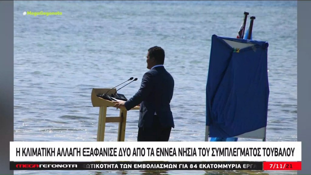 Ο υπουργός, ντυμένος με σακάκι και γραβάτα, διαβάζει μια ομιλία σχετικά με τους κινδύνους της ανόδου της στάθμης της θάλασσας. Πίσω του, φαίνονται οι σημαίες του Τουβαλού και του ΟΗΕ: μια πρωτοβουλία που στοχεύει να κάνει τους ανθρώπους να κατανοήσουν τον επείγοντα χαρακτήρα της περιβαλλοντικής κρίσης σε μια περιοχή που κινδυνεύει, όπως το αρχιπέλαγος του Ειρηνικού.