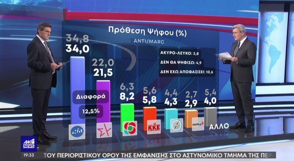 Ενδιαφέρουσα αποτελέσματα για το πολιτικό σκηνικό της χώρας και όχι μόνο κατέγραψε η δημοσκόπηση της Marc, που παρουσιάστηκε το βράδυ της Δευτέρας 15ης Νοεμβρίου στο κεντρικό δελτίο ειδήσεων του ΑΝΤ1, καθώς στην πρόθεση ψήφου η NΔ καταγράφει προβάδισμα 12,5 μονάδων έναντι του ΣΥΡΙΖΑ, ενώ το ΚΙΝΑΛ καταγράφει μεγάλη αύξηση ποσοστών του.