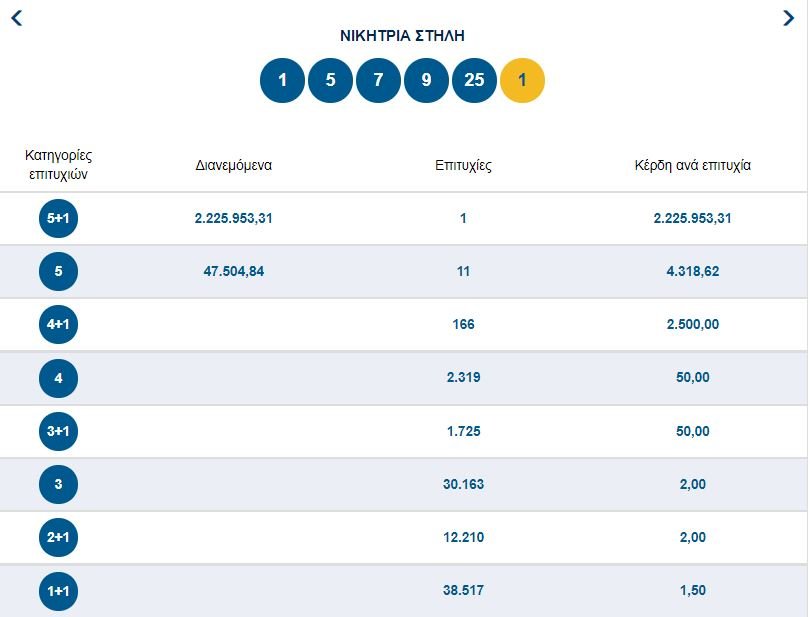 Οι τυχεροί αριθμοί που έβγαλε η κληρωτίδα είναι οι: 1, 5, 7, 9, 25 και Τζόκερ ο αριθμός 1.