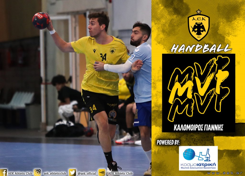 Η ομάδα χάντμπολ της ΑΕΚ πήρε μια εύκολη νίκη επί του Ιωνικού Νέας Φιλαδέλφειας για την 9η αγωνιστική του 1ου Ομίλου της Handball Premier στην αίθουσα «Γ. Κασιμάτης» του ΟΑΚΑ. Στο παιχνίδι αυτό ο Γιάννης Καλόμοιρος πήρε τον τίτλο του Κοσμοϊατρική Διαγνωστικό Εργαστήριο MVP. Ο ίντερ της ΑΕΚ πέτυχε 4 γκολ και είχε αρκετά καλή παρουσία σε όλη τη διάρκεια του αγώνα.