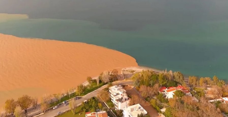 Τα πλάνα, τα οποία έχουν τραβηχτεί από drone, δείχνουν τη λάσπη να απλώνεται σταδιακά και να καλύπτει όλο και μεγαλύτερη έκταση στη θάλασσα, με αποτέλεσμα τα νερά από γαλάζια να παίρνουν χρωματισμούς πορτοκαλί.