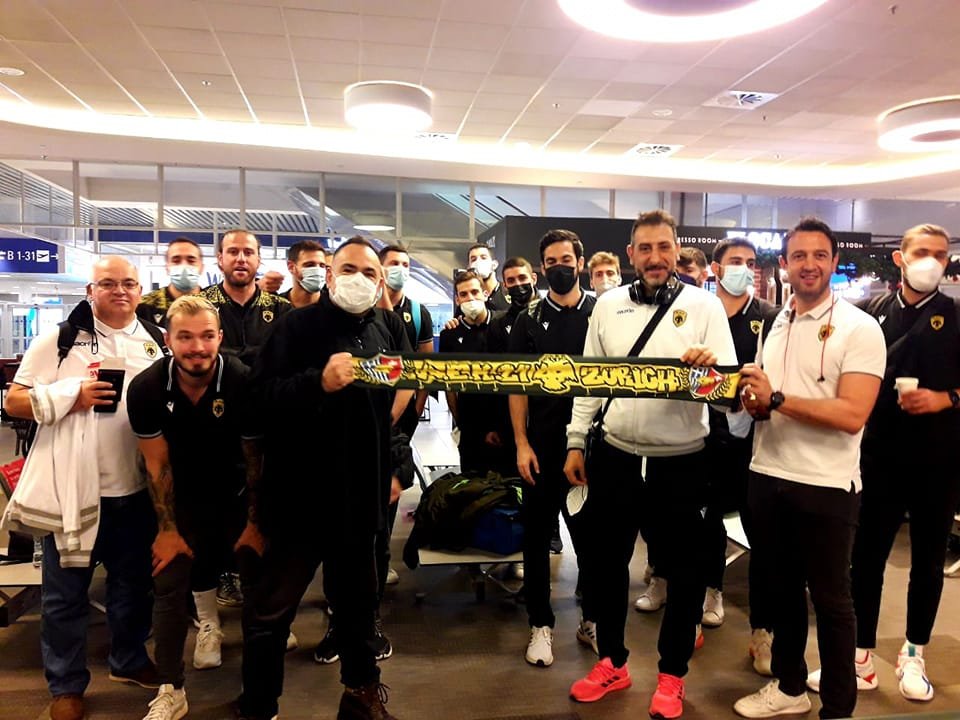 Πάτησε Ελβετία η αποστολή της ΑΕΚ και στο αεροδρόμιο υπήρξε υποδοχή από Ενωσίτες. Συγκεκριμένα φίλοι της ΑΕΚ από τη Ζυρίχη περίμεναν την ομάδα χάντμπολ που αύριο αντιμετωπίζει την Καντέτεν στο Σαφχάουζεν και την καλωσόρισαν με τον καλύτερο τρόπο. Μάλιστα η ομάδα θα μεταβεί για λίγο και στο τοπικό κλαμπ, ενώ το απόγευμα θα πραγματοποιήσει την τελευταία της προπόνηση στο γήπεδο της Καντέτεν με τον Δημήτρη Δημητρούλια να έχει στη διάθεση του σε σχέση με το ματς με την Σπόρτινγκ και τον Νάτσο Μόγια.