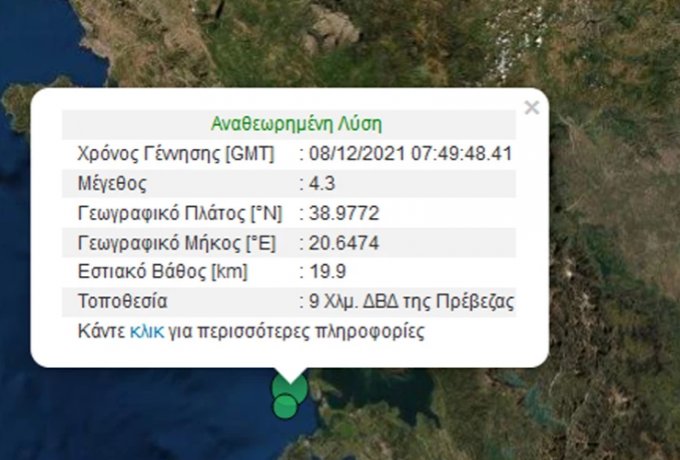 Σεισμός μεγέθους 4,3 Ρίχτερ σημειώθηκε στις 09.49 της Τετάρτης στην Πρέβεζα.