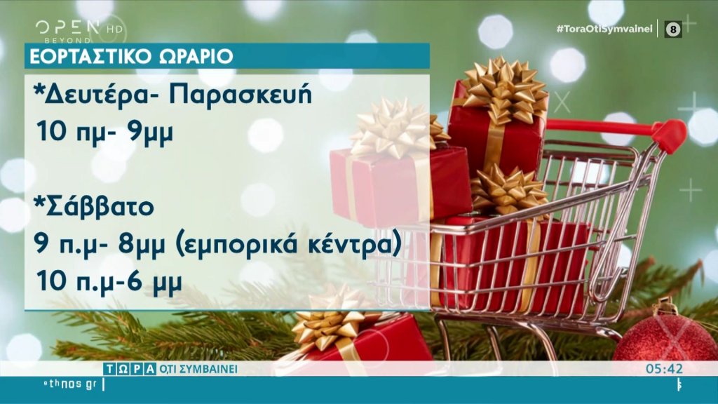 Αλλάζει το ωράριο στα καταστήματα. Συγκεκριμένα, θα είναι ανοιχτά Δευτέρα έως Παρασκευή 10πμ-9μμ και Σάββατο 9 π.μ - 8μμ τα εμπορικά καταστήματα και τα υπόλοιπα 10 π.μ - 6μμ. Μάλιστα, την Κυριακή 12/12 θα είναι ανοιχτά.