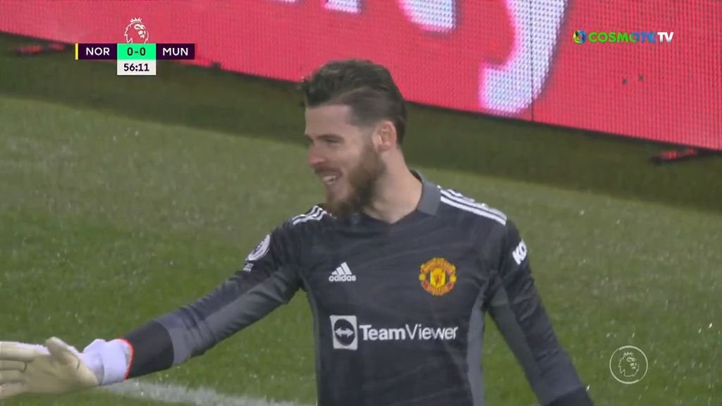 Ο Πούκι της Νόριτς έπιασε δυνατό σουτ, στο 57', με τον Ισπανό γκολκίπερ της Μάντσεστερ Γιουνάιτεντ να κρατάει ανέπαφη την εστία του με φοβερή απόκρουση