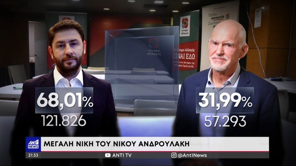 Συντριπτική η διαφορά με 68,04%-31,96% στο 88,23% των επίσημων αποτελεσμάτων - Άνετη επικράτηση Ανδρουλάκη σε Αττική και Κρήτη και στους ψηφοφόρους από το εξωτερικό
