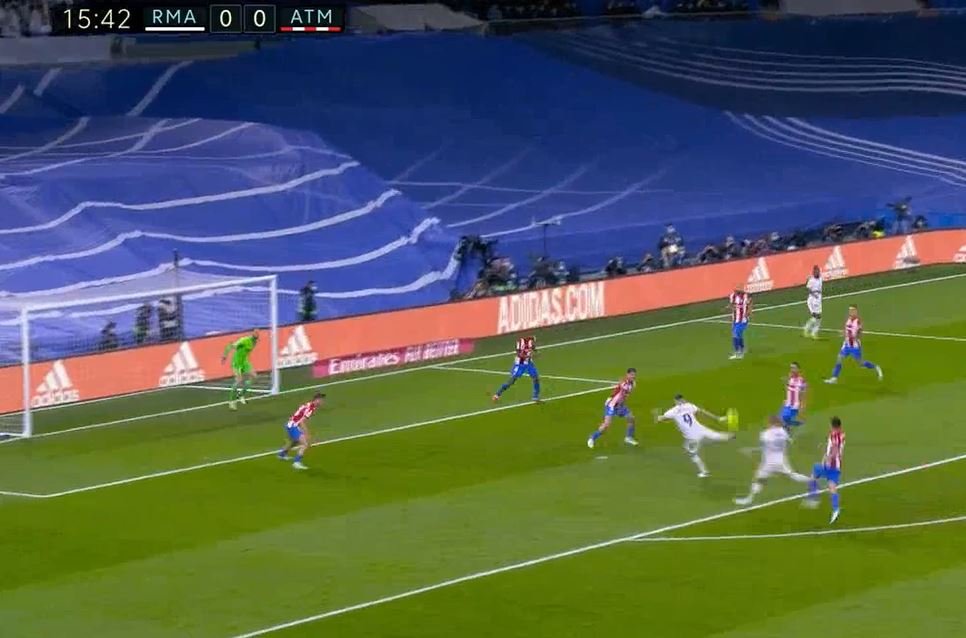 Ο Ασένσιο άνοιξε δεξιά στον Βινίσιους, εκείνος σήκωσε το κεφάλι και γύρισε στον Μπενζεμά που με γυριστό σουτ από το πέναλτι, έγραψε το 1-0.
