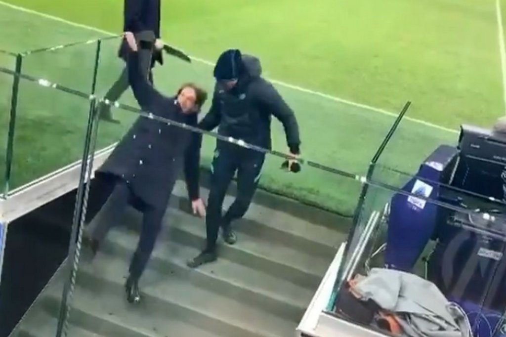 Συγκεκριμένα, την ώρα που είχε αποχωρήσει από τον αγωνιστικό χώρο και κατέβαινε τα σκαλιά, κατευθυνόμενος στα αποδυτήρια, ο προπονητής της Ίντερ έχασε την ισορροπία του και πήρε μία θεαματική τούμπα, με τον ίδιο να σηκώνεται πάντως γρήγορα και να καθησυχάζει τους φιλάθλους με μία χειρονομία του πως είναι απολύτως καλά.