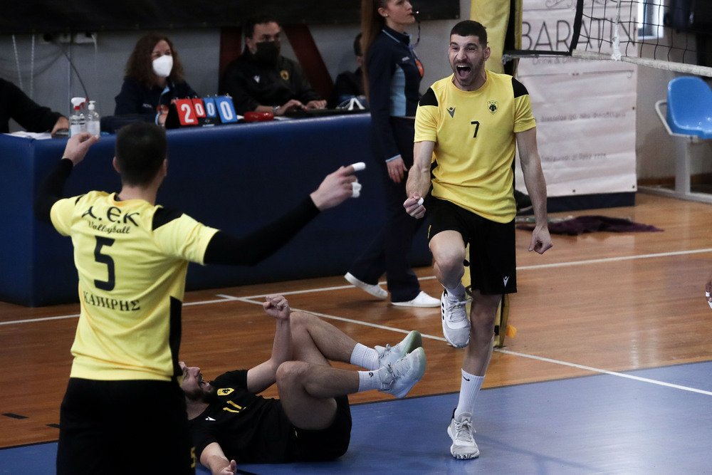 Αν και στο τρίτο σετ η ΑΕΚ έμεινε πίσω (6-9), δεν το έβαλε κάτω και πάλεψε αρκετά (9-10), φτάνοντας να ισοφαρίσει (10-10). Οι δυο ομάδες από εκεί και πέρα πήγαιναν χέρι χέρι (15-15, 17-17). Ενώ, με ένα σερί σε κρίσιμο σημείο οι «κιτρινόμαυροι» πέρασαν μπροστά (21-18) και τελικά μείωσαν σε 1-2 σετ (25-22).