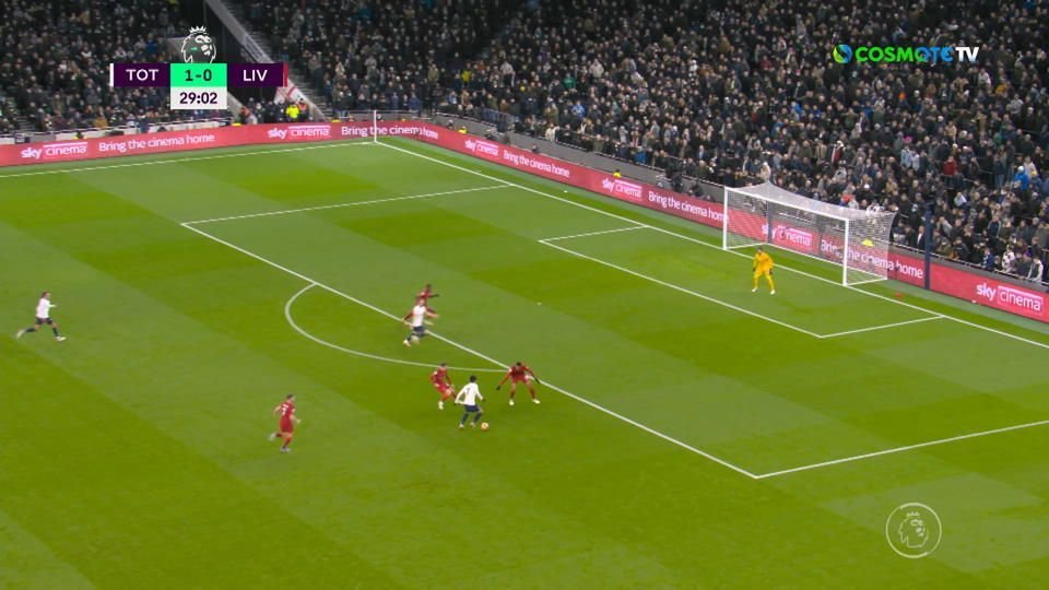 Στο 30ο λεπτό, ο Άγγλος μεσοεπιθετικός της Τότεναμ βρέθηκε, ξεμαρκάριστος, σε θέση βολής, πλάσαρε, αλλά ο Βραζιλιάνος γκολκίπερ της Λίβερπουλ τού αρνήθηκε το γκολ