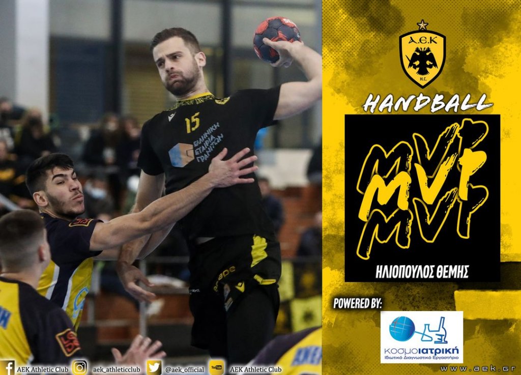 Ο Θέμης Ηλιόπουλος αναδείχθηκε κορυφαίος παίκτης της αναμέτρησης για την 14η αγωνιστική του 1ου Ομίλου της Handball Premier απέναντι στον Άρη Νίκαιας. Ο νεαρός ίντερ της ΑΕΚ πέτυχε μια εξαιρετική εμφάνιση και βρήκε δίχτυα 6 φόρες, με αποτέλεσμα να κερδίσει τον τίτλο «Κοσμοϊατρική Διαγνωστικό Εργαστήριο» MVP του αγώνα.