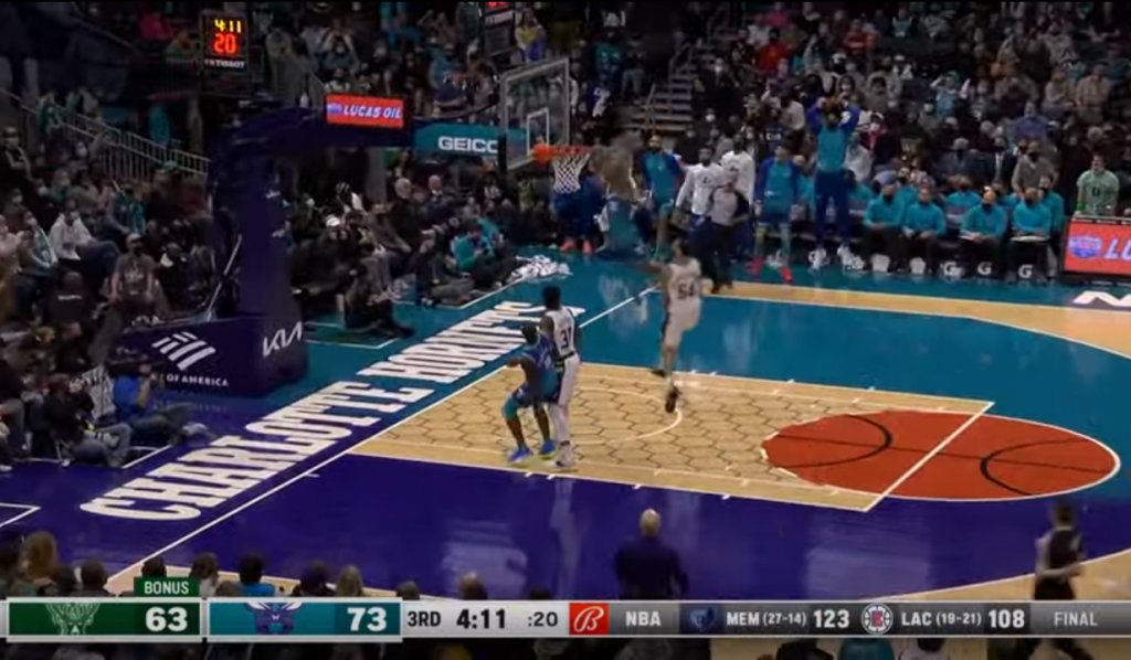 Ο Χέιγουορντ έριξε τάπα στον Γκάλογουεϊ των Μπακς και, στην εξέλιξη της φάσης, ο Ροζίερ πάσαρε στον 26χρονο γκαρντ των Χόρνετς που κάρφωσε, στην κορυφαία φάση των αγώνων που έγιναν τα ξημερώματα