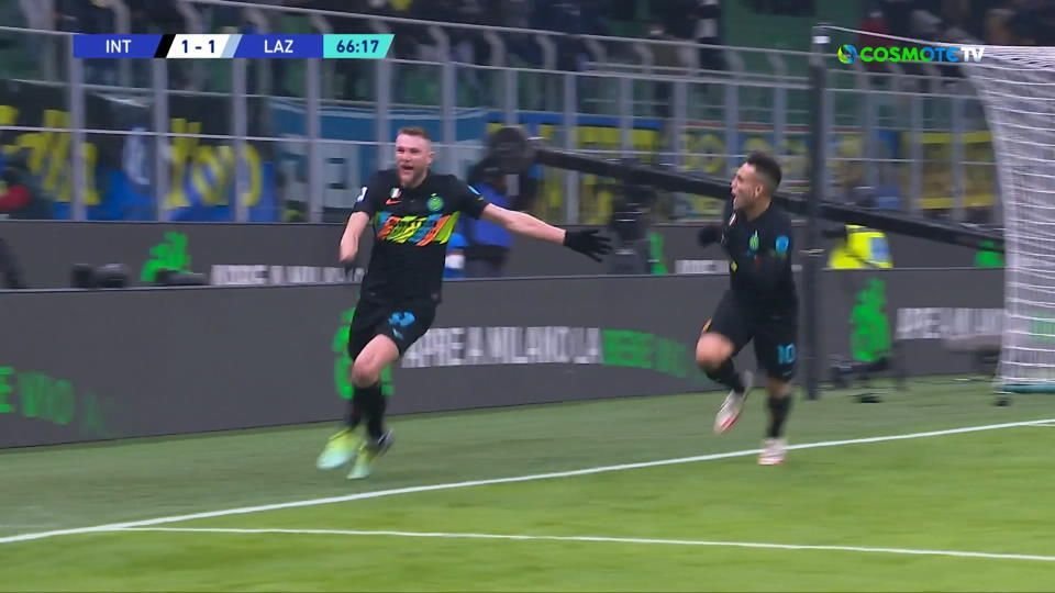 Όμως στο 30’ η άμυνα της Λάτσιο έδιωξε μετά το κόρνερ και ο Μπαζτόνι με πανέμορφο σουτ έξω από την περιοχή έκανε το 1-0.