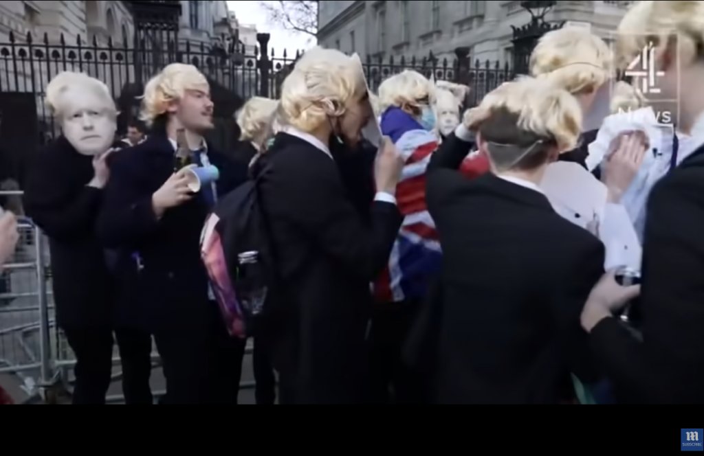 Ομάδα 100 ατόμων, φορώντας περούκα αλά Μπόρις Τζόνσον, οργάνωσαν το δικό τους πάρτι με κρασί και μπύρες έξω από την Ντάουνινγκ Στριτ. «Είμαστε Μπόρις, είναι εκδήλωση για τη δουλειά», φώναζαν, σαφή αναφορά στις προ ημερών δηλώσεις του Βρετανού πρωθυπουργού, ο οποίος ζήτησε «συγγνώμη» για τη συμμετοχή του σε άλλο πάρτι. Όπως είχε πει, εκτίμησε ότι επρόκειτο για συγκέντρωση εργασίας.