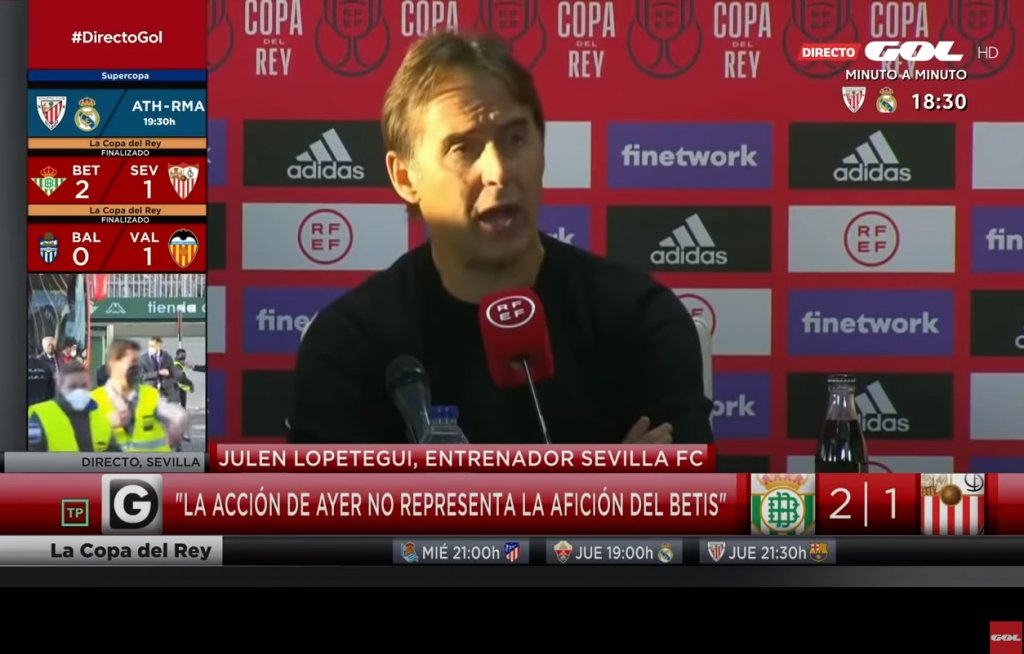 Εξέλιξη που προκάλεσε έντονο εκνευρισμό στις τάξεις των Σεβιγιάνων και συγκεκριμένα στον Γιουλέν Λοπετέγκι, ο οποίος μετά το τέλος του ματς μίλησε με σκληρό τόνο για την απόφαση της ισπανικής Ποδοσφαιρικής Ομοσπονδίας να συνεχιστεί, την επόμενη ημέρα, το παιχνίδι.