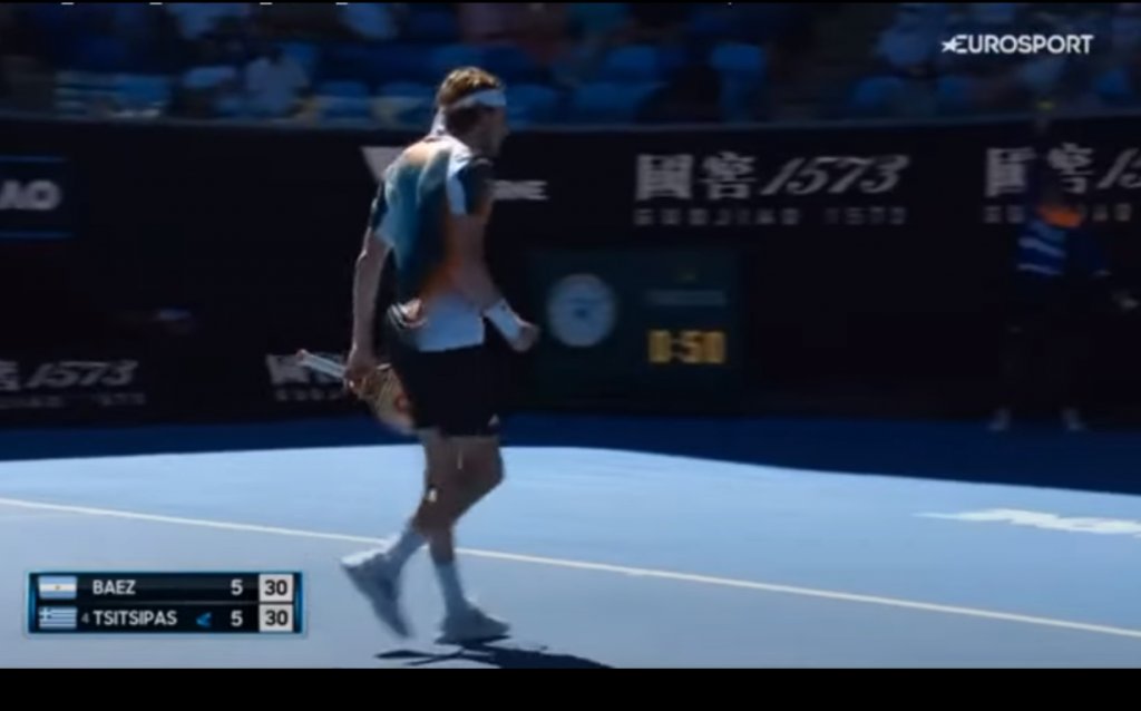 Με drop shot έκανε το 1-0 στο τέταρτο σετ ο Μπάεζ στο τέταρτο σετ. Ο Στέφανος κράτησε εύκολα το σερβίς του και μετά από τρεις ευκαιρίες έκανε το break με λάθος σε άμυνα του αντιπάλου του. Με άσο και ένα λάθος του Αργεντινού ήρθε το 3-1 για τον Ελληνα τενίστα. Με επιστροφή στο φιλέ του Στεφ, ο Μπάεζ μείωσε 3-2. Ο Στέφανος κράτησε το σερβίς του και έφτασε στη συνέχεια στο 5-3 με τον Μπάεζ να σερβίρει για να μείνει στο ματς. Το έκανε με love service game και ο Στέφανος σέρβιρε στη συνέχεια για το ματς, κερδίζοντας το παιχνίδι.