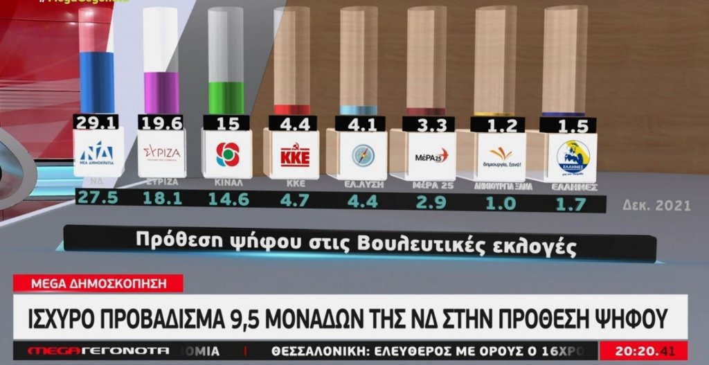 Δημοσκόπηση της εταιρείας Metron Analysis προβλήθηκε το βράδυ της Πέμπτης 20ης Ιανουαρίου στο κεντρικό δελτίο ειδήσεων του Mega και σύμφωνα με τα αποτελέσματα της έρευνας, που είχε δείγμα 1.300 ερωτηθέντων, στην πρόθεση ψήφου η ΝΔ προηγείται με 9,5 μονάδες έναντι του ΣΥΡΙΖΑ, ενώ το ΚΙΝΑΛ συγκεντρώνει το 15% δείχνοντας σταθερή τάση αύξησης.