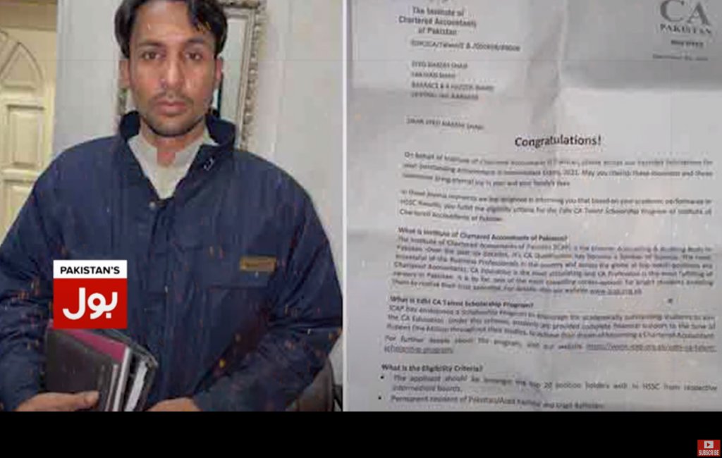 Ο 35χρονος Syed Naeem Shah, σημείωσε την υψηλότερη βαθμολογία στις εξετάσεις γενικού γυμνασίου μεταξύ των υποψηφίων πέρυσι στη μεγαλύτερη πόλη του Πακιστάν, κερδίζοντας υποτροφία για περαιτέρω σπουδές από το Institute of Chartered Accountants of Pakistan ( ICAP).