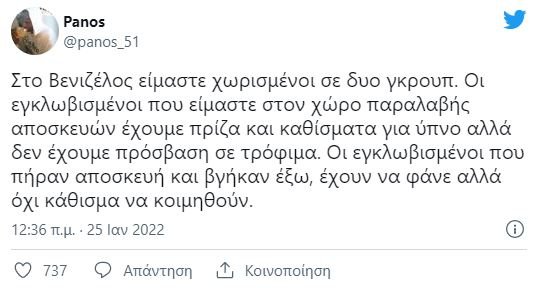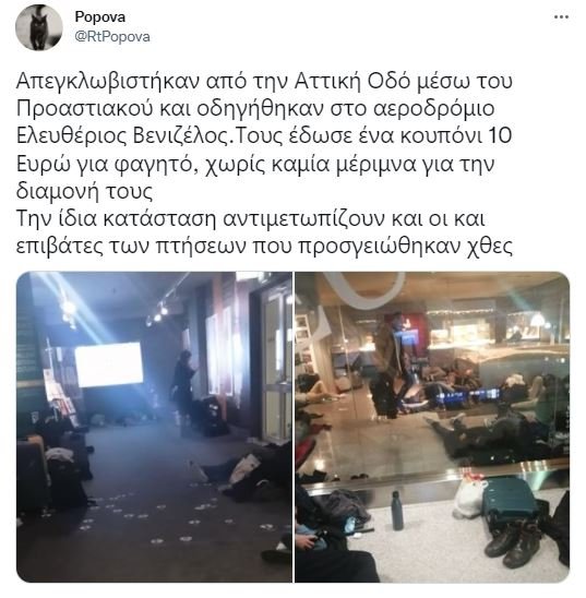 Σύμφωνα με την καταγγελία άλλου επιβάτη που είναι εγκλωβισμένος στο χώρο παραλαβής αποσκευών λόγω του σημείου που είναι εγκλωβισμένος δεν έχουν πρόσβαση ούτε σε φαγητό από τις 10 το βράδυ που βρίσκονται εκεί. Παράλληλα, δεν έχουν καμία ενημέρωση για το τι θα συμβεί.