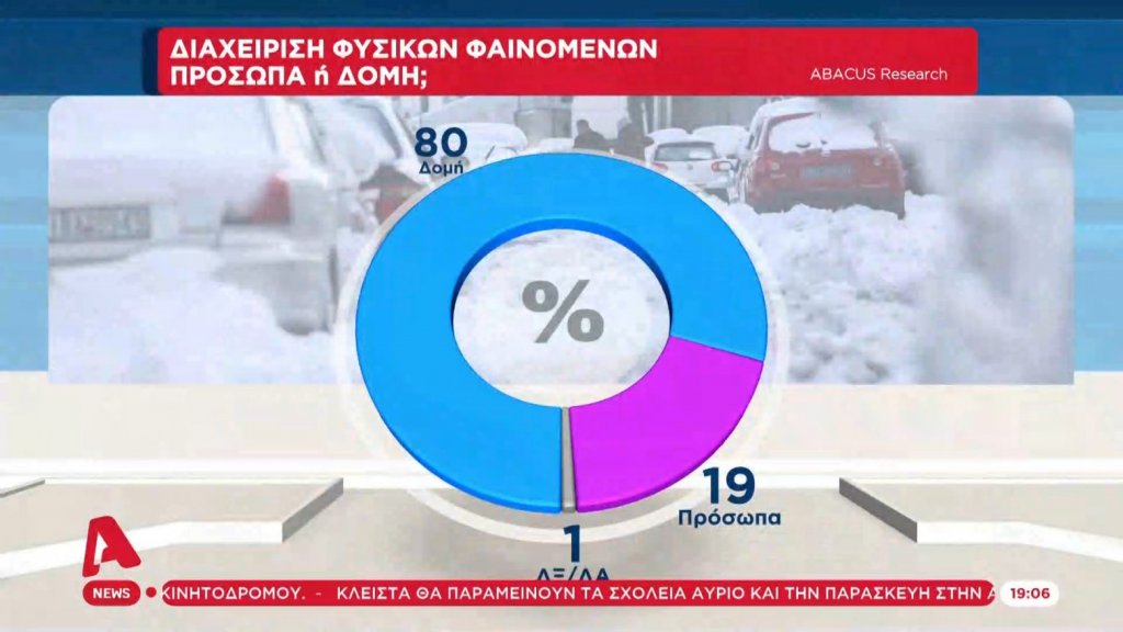 Μια πρώτη δημοσκόπηση μετά το φιάσκο της διαχείρισης της κακοκαιριας «Ελπίδα» διενεργήθηκε από την Abacus, για λογαριασμό του Alpha. Σε αυτή καταγράφεται η αρνητική στάση των πολιτών τόσο κατά της κυβέρνησης όσο και κατά της εταιρείας διαχείρισης της Αττικής οδού.