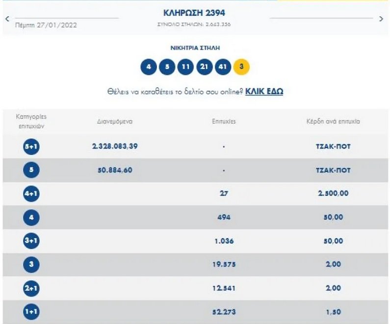 Οι αριθμοί που κληρώθηκαν είναι: 4, 5, 11, 21, 41 και τζόκερ το 3.