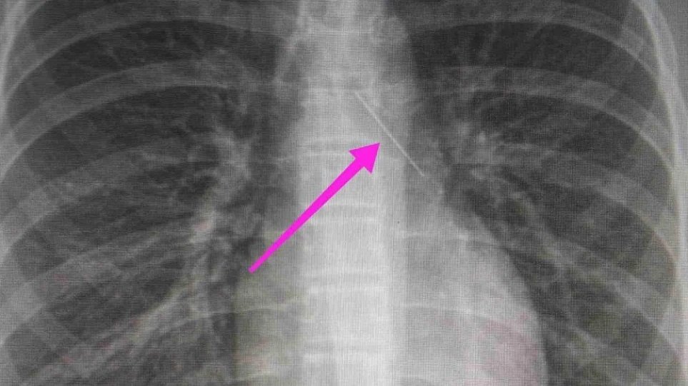 “Χθες 30/1/2022 στις 16:00 στο Τ.Ε.Π. του ΓΝΘ Ιπποκράτειο, προσήλθε ανήλικη συνοδευόμενη από τους γονείς της, μετά από αναφερόμενη κατάποση ξένου σώματος (καρφίτσα). Από την απεικονιστική διερεύνηση που πραγματοποιήθηκε με ακτινογραφία θώρακος αρχικά και ακολούθως με αξονική τομογραφία θώρακος, διαπιστώθηκε η ύπαρξη αιχμηρού μεταλλικού ξένου σώματος στην αναπνευστική οδό (αριστερός κύριος βρόγχος) και όχι στην πεπτική οδό.